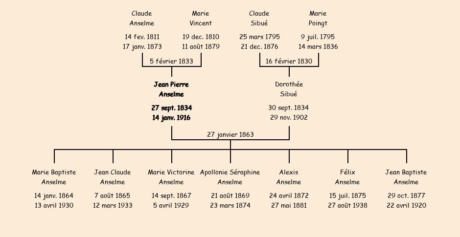 Témoins : Antoine Sibué 58 ans laboureur fils Michel décédé, oncle de l'épouse, Alexis Sibué 32 ans agriculteur fils de Claude et frère de l'épouse, Séraphin Vincent 28 ans laboureur fils de Jean Claude et cousin de l'époux et Georges Crinel fils Michel décédé, 26 ans beau frère de l'époux |