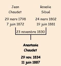 Mère : Rosalie Sibué, fille de François | Marraine : Anastasie Chaudet (fille de Jean Baptiste) |