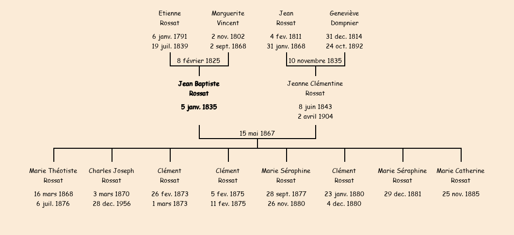 Epouse : Jeanne Clémentine Rossat (23 ans, née le 8 juin1843, du Chef Lieu, cultivatrice, n'a pas su signer), fille de Jean (cultivateur, a signé) et de Geneviève Dompnier (cultivatrice, n'a pas su signer) |
