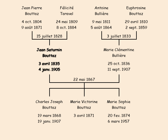 Père : Jean Pierre Bouttaz, fils de Jean Baptiste | Parrain : Jean Saturnin Bouttaz (oncle du baptisé) |