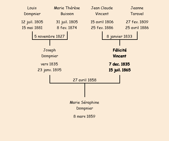 Epouse : Marie Félicité Vincent (22 ans, a marqué), fille de Jean Claude (a signé) et de Jeanne Taravel |