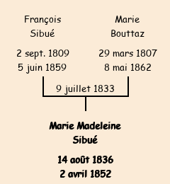 Père : François Sibué, fils de Jean Baptiste | Parrain : François Bouttaz (aïeul de la baptisée) |