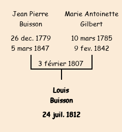 Père : Jean Pierre Buisson, fils de Jean Baptiste | Parrain : Louis Gilbert (fils de Jean Baptiste) |