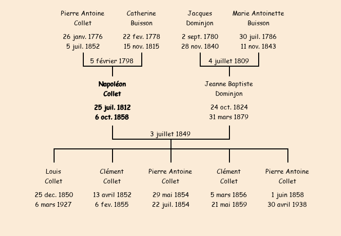 Epoux : Napoléon Collet (37 ans, a signé), fils de Pierre Antoine (a signé) et de feue Catherine Buisson |