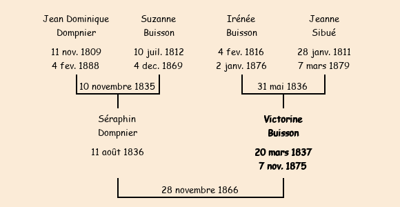Epouse : Victorine Buisson (29 ans, née le 20 mars1837, de La Rochette, cultivatrice, n'a pas su signer), fille de Irénée (cultivateur à La Rochette, a signé) et de Jeanne Sibué (cultivatrice, n'a pas su signer) |