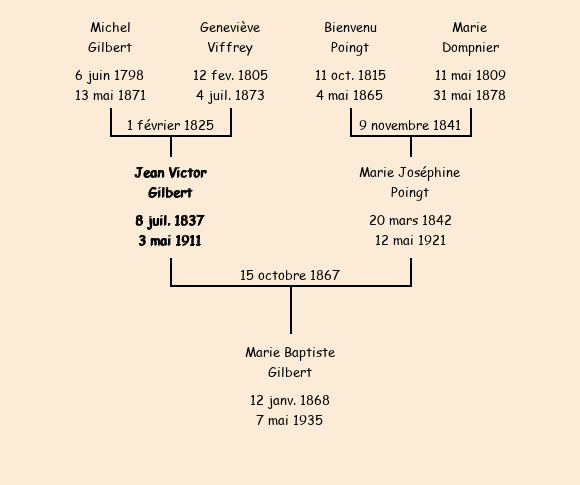 Père : Michel Gilbert, fils de Louis | Parrain : Jean Marie Gilbert (fils de Jean Baptiste décédé, frère de la marraine) |