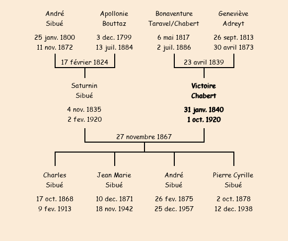 Epoux : Saturnin Sibué (32 ans, né le 4 novembre1835, cultivateur à La Bise, a signé), fils de André (cultivateur, a signé) et de Apollonie Bouttaz (cultivatrice, n'a pas su signer) |