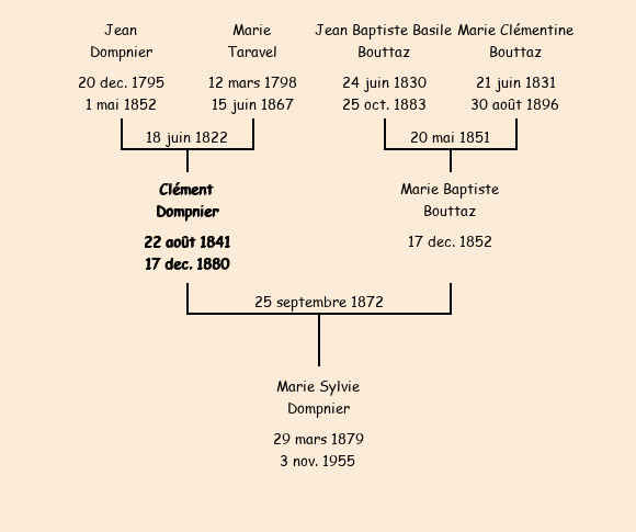 Epouse : Marie Baptiste Bouttaz (19 ans, née le 17 décembre1852, du Chef Lieu, cultivatrice, a signé), fille de Jean Baptiste (cultivateur au Chef Lieu, a signé) et de Clémentine Bouttaz (cultivatrice au Chef Lieu, n'a pas su signer) |