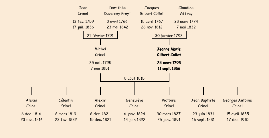 Père : Jacques Gilbert Collet, fils de Pierre Antoine | Parrain : Pierre Antoine Gilbert Collet (grand-père) |