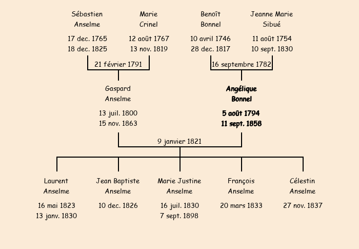 Epouse : Marie Angélique Bonnel, fille de feu Benoît et de Jeanne Françoise Sibué |
