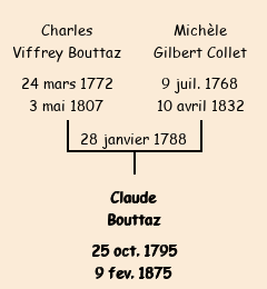 Mère : Michèle Collet, fille de Antoine | Marraine : Jeanne Collet (épouse de Jean Baptiste Bouttaz) |