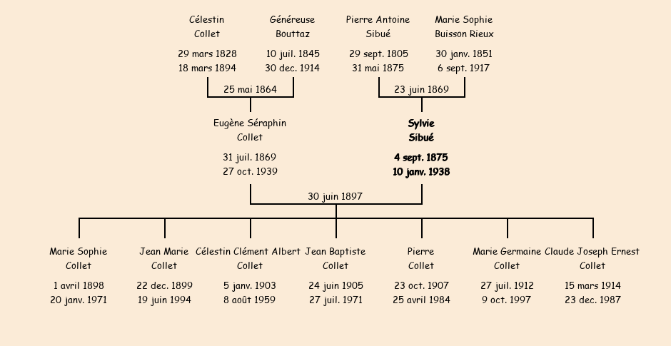 Epouse : Sylvie Sibué (21 ans, née le 4 septembre1875, du Villard, cultivatrice, a signé), fille de Pierre Antoine (décédé le 31 mai1875 au Villard) et de Sophie Buisson Rieux (ménagère, a signé) |