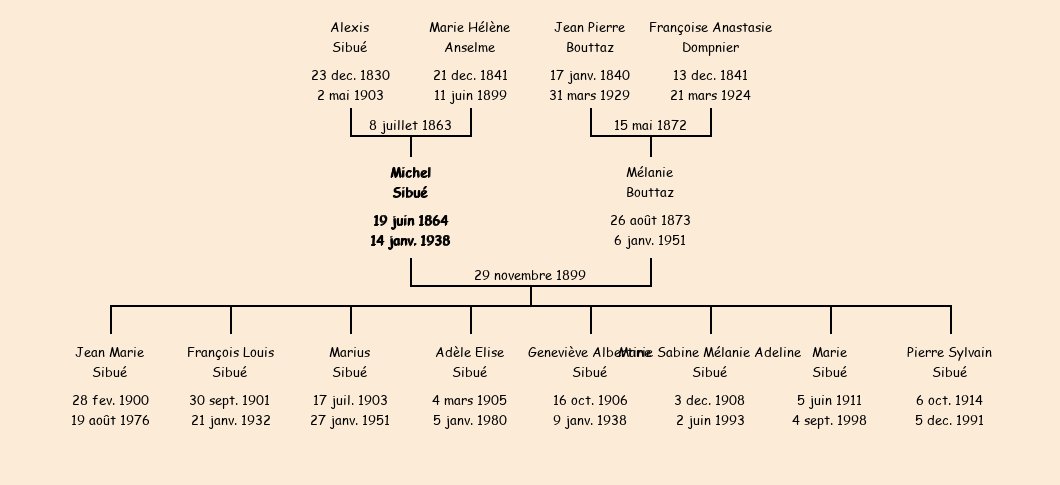 Epoux : Michel Sibué (35 ans, né le 19 juin1864 à La Bise, cultivateur à La Bise, a signé), fils de Alexis (cultivateur à La Bise, a signé) et de Marie Hélène Anselme (décédée à La Bise le 11 juin1899) |