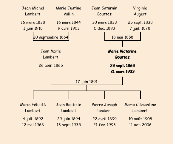 Epouse : Marie Victorine Bouttaz (23 ans, née le 23 septembre1868, du Chef Lieu, cultivatrice, a signé), fille de Jean Saturnin (cultivateur au Chef Lieu, a signé) et de Virginie Augert (décédée le 7 juillet1878) |