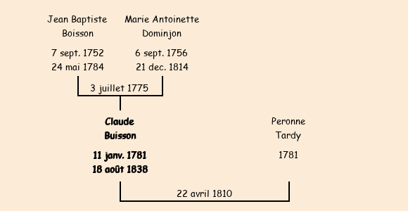 Epoux : Claude Buisson, fils de feu Jean Baptiste et de Marie Antoinette Dominjon |