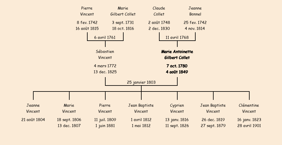 Epoux : Sébastien Vincent, fils de Pierre et de Marie Collet (veuve de Jean baptiste Chabert) |
