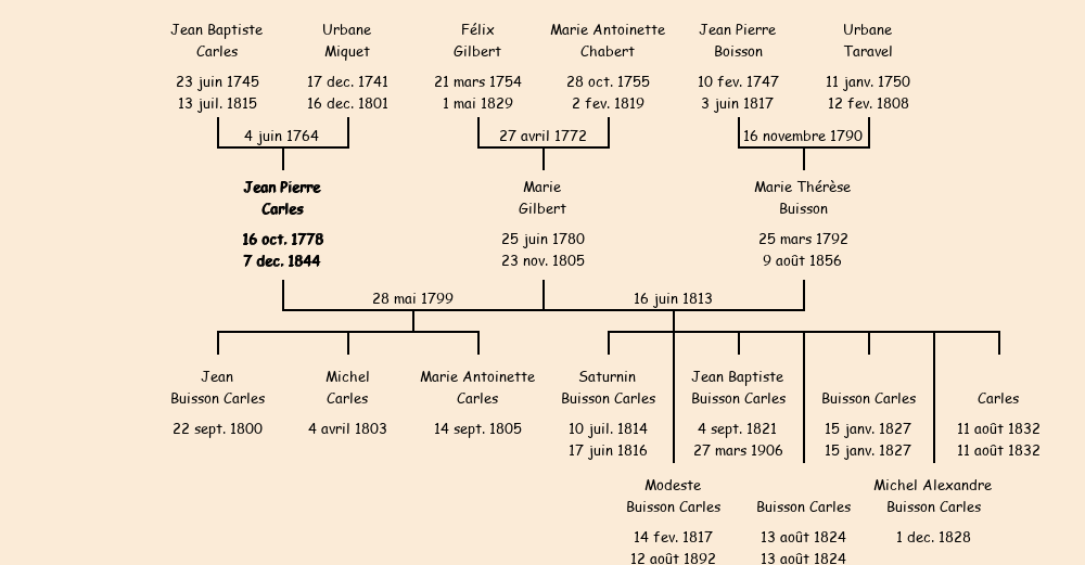 Epoux : Jean Pierre Carles, fils de Jean Baptiste et de Urbaine Miquet |