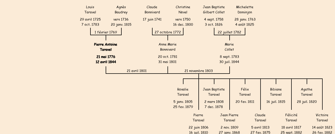 Epoux : Pierre Antoine Taravel (veuf de Marie Bonnivard), fils de feu Louis et de Agnès Boudray |