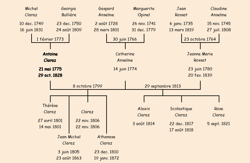 Père : Michel Claraz | Parrain : Antoine Viffrey Bullière (fils de Jean Baptiste, frère de la marraine) |