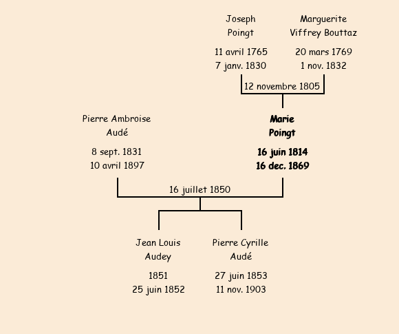 Mariée (36 ans) avec Pierre Ambroise Audé (18 ans) le 16 juillet 1850 à Saint-Jean-de-Maurienne |