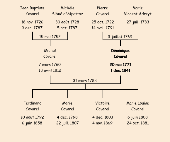 Epoux : Michel Covarel, fils de feu Jean Baptiste et de Michelette Sibué |