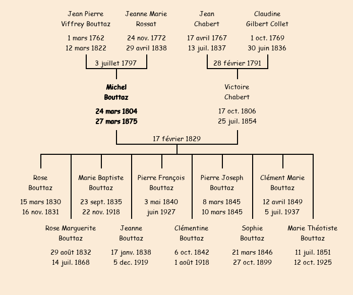 Mère : Jeanne Marie Rossat, fille de Alexandre | Marraine : Rose Bouttaz (fille de Pierre Antoine) |