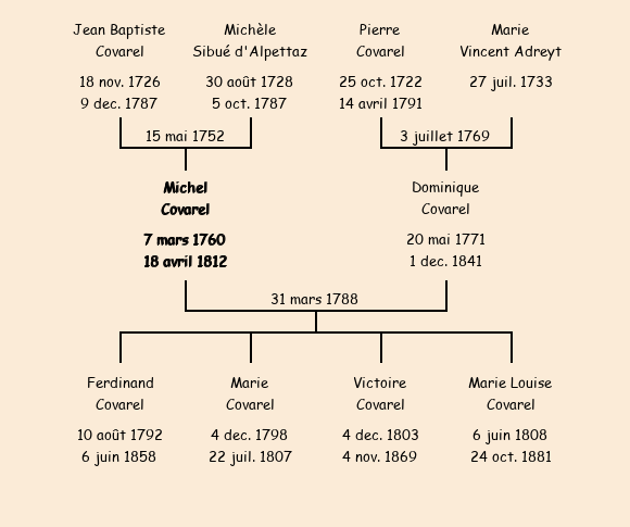 Epoux : Michel Covarel, fils de feu Jean Baptiste et de Michelette Sibué |