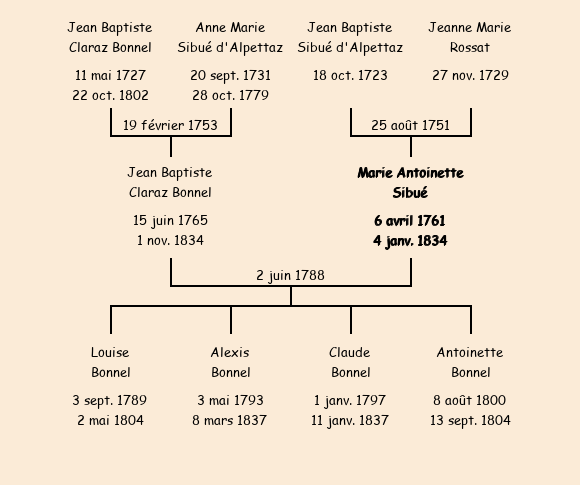 Epouse : Marie Antoinette Sibué, fille de Jean Baptiste (l'ainé) et de Jeanne Marie Rossat |