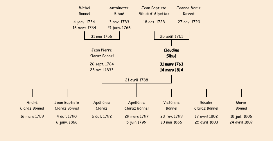 Epoux : Jean Pierre Claraz Bonnel, fils de feu Michel et de Antoinette Sibué |