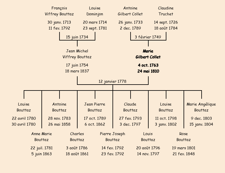 Mariée (14 ans) avec Jean Michel Viffrey Bouttaz (23 ans) le 12 janvier 1778 à Fontcouverte ![]() |