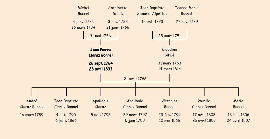 Epoux : Jean Pierre Claraz Bonnel, fils de feu Michel et de Antoinette Sibué |