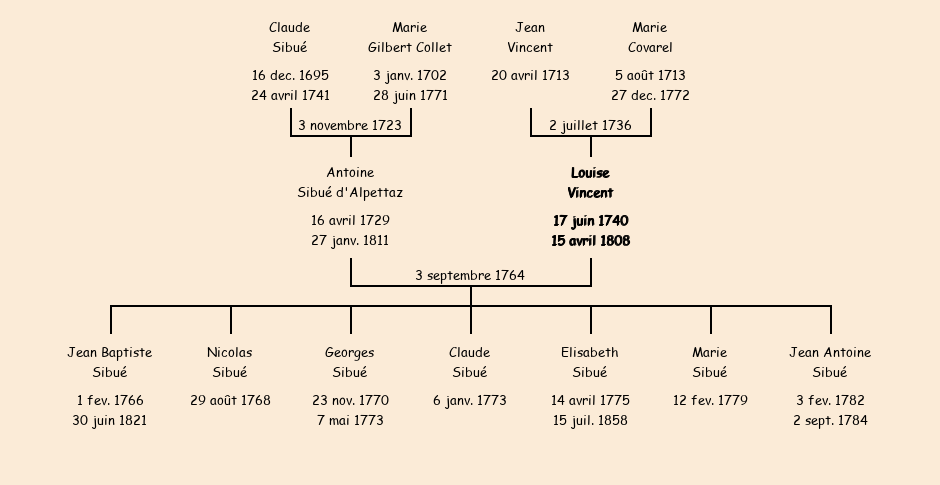 Mariée (24 ans) avec Antoine Sibué d'Alpettaz (35 ans) le 3 septembre 1764 à Fontcouverte ![]() |