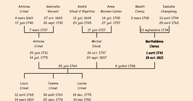 Epouse : Barthélémie Claraz (veuve d'Antoine Crinel), fille de feu Benoït et de feue Elisabeth Champlong |