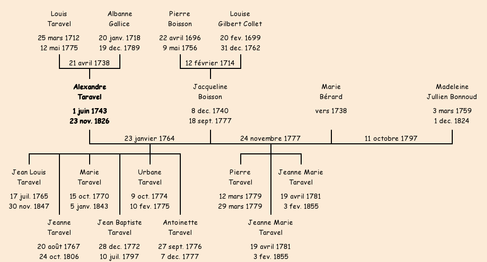 Epoux : Alexandre Taravel (veuf en dernières noces de Marie Bérard), fils de feu Louis et de feue Urbaine Gallice |