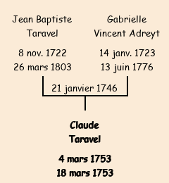 Père : Jean Baptiste Taravel | Parrain : Claude Vincent Adreyt |