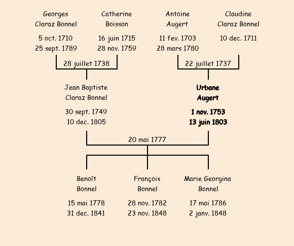 Mère : Claudine Claraz Bonnel | Marraine : Urbane Anselme (épouse de Claude Claraz Bonnel) |