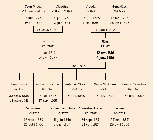 Epoux : Saturnin Bouttaz (veuf de Séraphine Augert), fils de Jean Michel et de Jeanne Gilbert Collet |