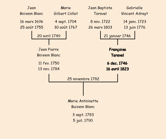 Mère : Gabrielle Vincent Adreyt | Marraine : Françoise Bonnel (épouse de Jean Taravel) |