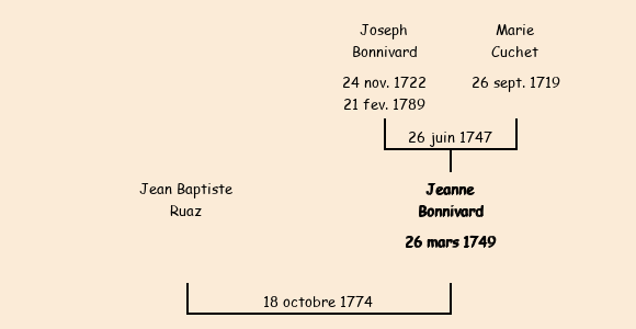 Mariée (25 ans) avec Jean Baptiste Ruaz le 18 octobre 1774 à Fontcouverte ![]() |