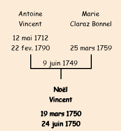 Père : Antoine Vincent | Parrain : Noël Vincent (fils d'un autre Noël Vincent, frère de la marraine) |