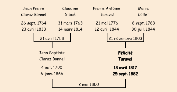 Epouse : Félicité Taravel (33 ans, a marqué), fille de feu Pierre Antoine et de feue Marie Collet |