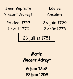 Mère : Louise Anselme | Marraine : Marie Vincent Adreyt (fille de Claude) |