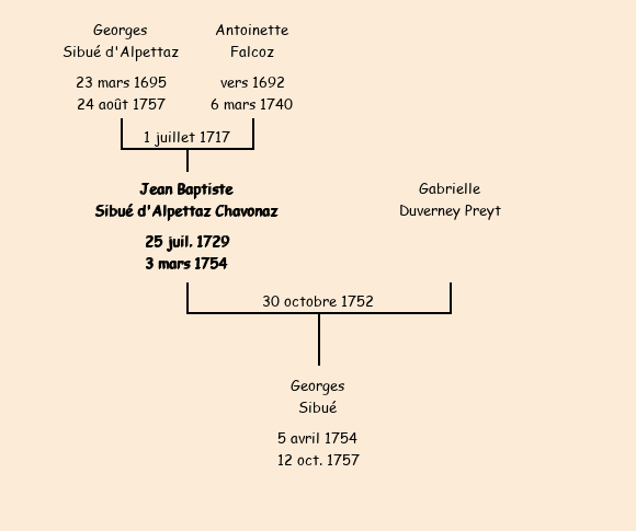 Père : Georges Sibué d'Alpettaz Chavonaz | Parrain : Jean Baptiste Sibué d'Alpettaz (fils de Georges, frère de la marraine) |