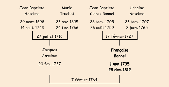 Mariée (28 ans) avec Jacques Anselme (26 ans) le 7 février 1764 à Saint-Jean-de-Maurienne |