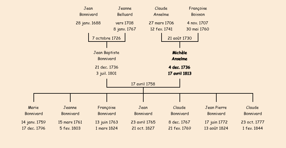 Mariée (21 ans) avec Jean Baptiste Bonnivard (21 ans) le 17 avril 1758 à Fontcouverte ![]() |