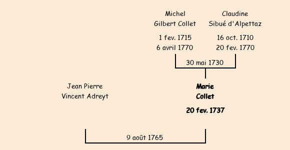Mariée (28 ans) avec Jean Pierre Vincent Adreyt le 9 août 1765 à Saint-Jean-de-Maurienne |