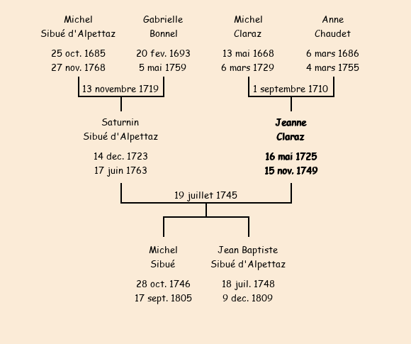 Mariée (20 ans) avec Saturnin Sibué d'Alpettaz (21 ans) le 19 juillet 1745 à Fontcouverte ![]() |