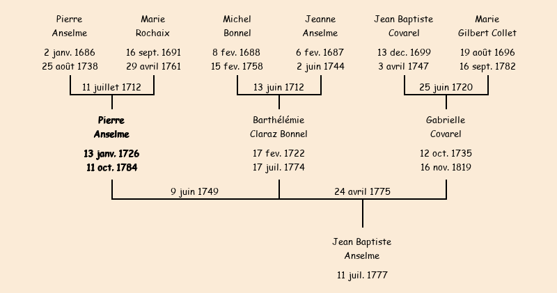 Epoux : Pierre Anselme (veuf de Barthélémie Claraz Bonnel fille de Michel dédédé), fils de Pierre |