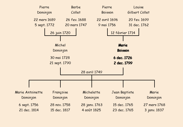 Mariée (22 ans) avec Michel Dominjon (20 ans) le 28 avril 1749 à Fontcouverte ![]() |