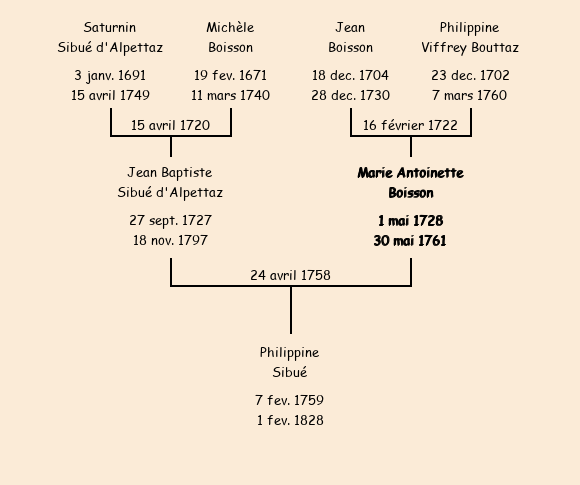 Mariée (29 ans) avec Jean Baptiste Sibué d'Alpettaz (30 ans) le 24 avril 1758 à Fontcouverte ![]() |